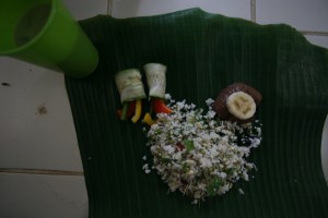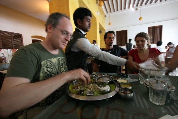Along the way, we also took the opportunity to try as many restaurants as possible. One of our first encounters with local food was at the Mohanaman Centre. The centre is devoted to offering space for children to play sports and engage in cultural activities. The manager there invited us to a typical south indian lunch. All 21 of us sat around the huge casseroles of prepared daals, rice, papads and vegetables eagerly waiting to be served on our individual banana leaves. This was the first time (during this trip at least) the students were faced with the situation of having food in front of them and no utensils. That did not bother us, as we delved into the dish wiping it clean and licking our fingers full or rice and daal.