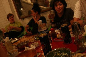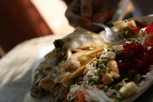 Working at Upasana, I often went for lunch to the next door israeli restaurant Well Café. I enjoyed the variety of mediterranean, greek and israeli foods there and found the mint water very refreshing after riding around in the sun all day. Well Café also had a Japanese guest chef and we were invited to a special organic vegetarian sushi night, a bit strange but very interesting. Although we didn’t really enjoy the jam session at Solitude Farm, the food there was remarkable. Once again, organic veggies accompanied with refreshing tea filled our stomachs. Towards the end of the trip, we ate a completely raw vegan dish, served with Kamboucha, a mushroom based drink supposed to revitalize the body and a vegan chocolate mousse for desert: