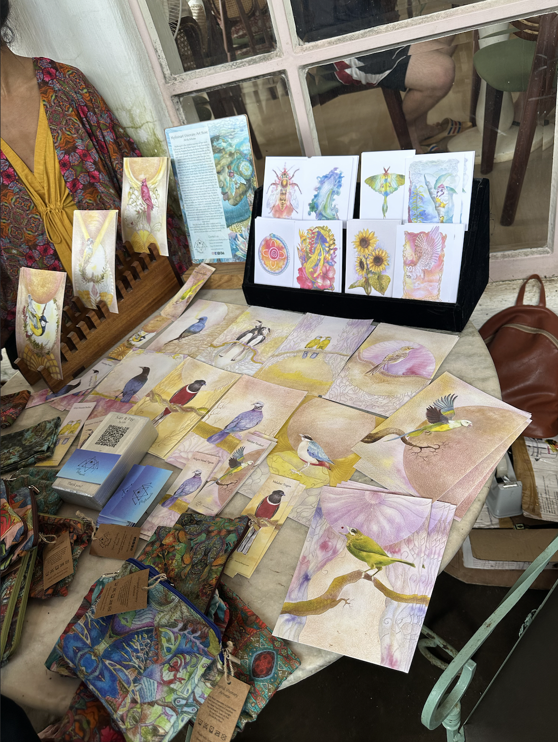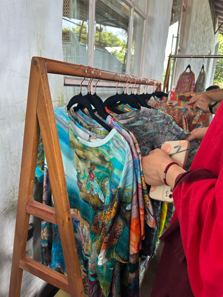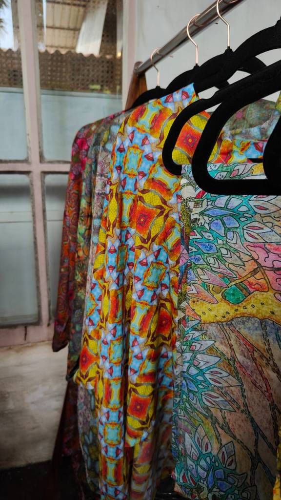 In the middle of a beautiful day of NGO visits, we found ourselves nestled in the cozy enclave beside Conscious Cafe. The air was abuzz with the vibrant energy of people peddling their homemade treasures at various stalls. At the last stall, we congregated around a captivating rack of exquisite clothing, all in vibrant colors. That’s when Puja, the visionary behind Mythsinsart, warmly welcomed us into her world.
