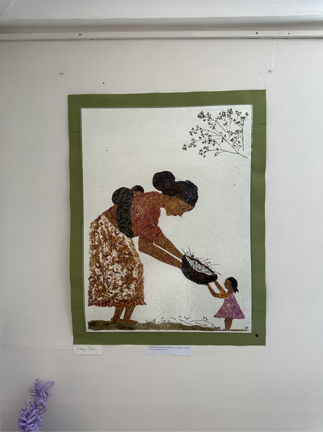 After her introduction, we were delighted to learn that we caught the last day of an art exhibition showcasing the artwork of one of Shradhanjali’s interns named Akay Jharia. Each piece was crafted in the distinctive Shradhanjali style of pressed flowers, and portrayed images inspired by her life. After hitting our heads on a few bell roosters hanging from the ceiling, we walked a few steps over into the heart of the operation.