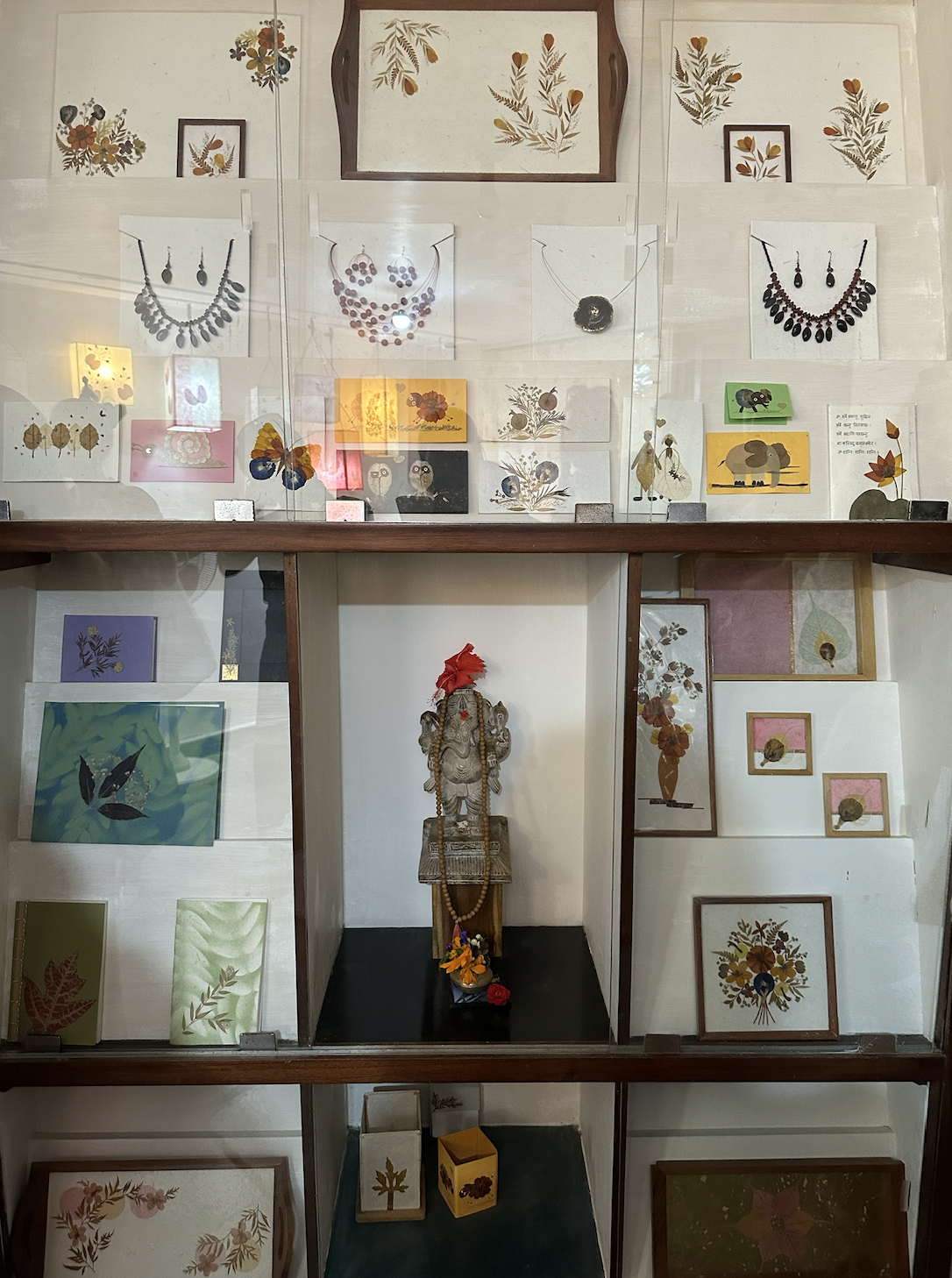 After a delicious lunch at Sudha’s kitchen, our group of 14 American students set off with towards the enchanting world of Shradhanjali. In the entryway, we had the pleasure of strolling through a picturesque garden with a serene pond. As we approached, we were warmly welcomed by Abha, founder of Shradhanjali. She begins by explaining that Shradhanjali is an early Aurovillian foundation specializing in handicrafts. Their unique creations involve pressed flowers and leaves sourced straight from their blooming garden and delicately arranged on homemade paper. The foundation creates beautiful works of art, but is also dedicated to empowering women from neighboring villages. They currently employ 19 individuals from 11 different villages in the bioregion.