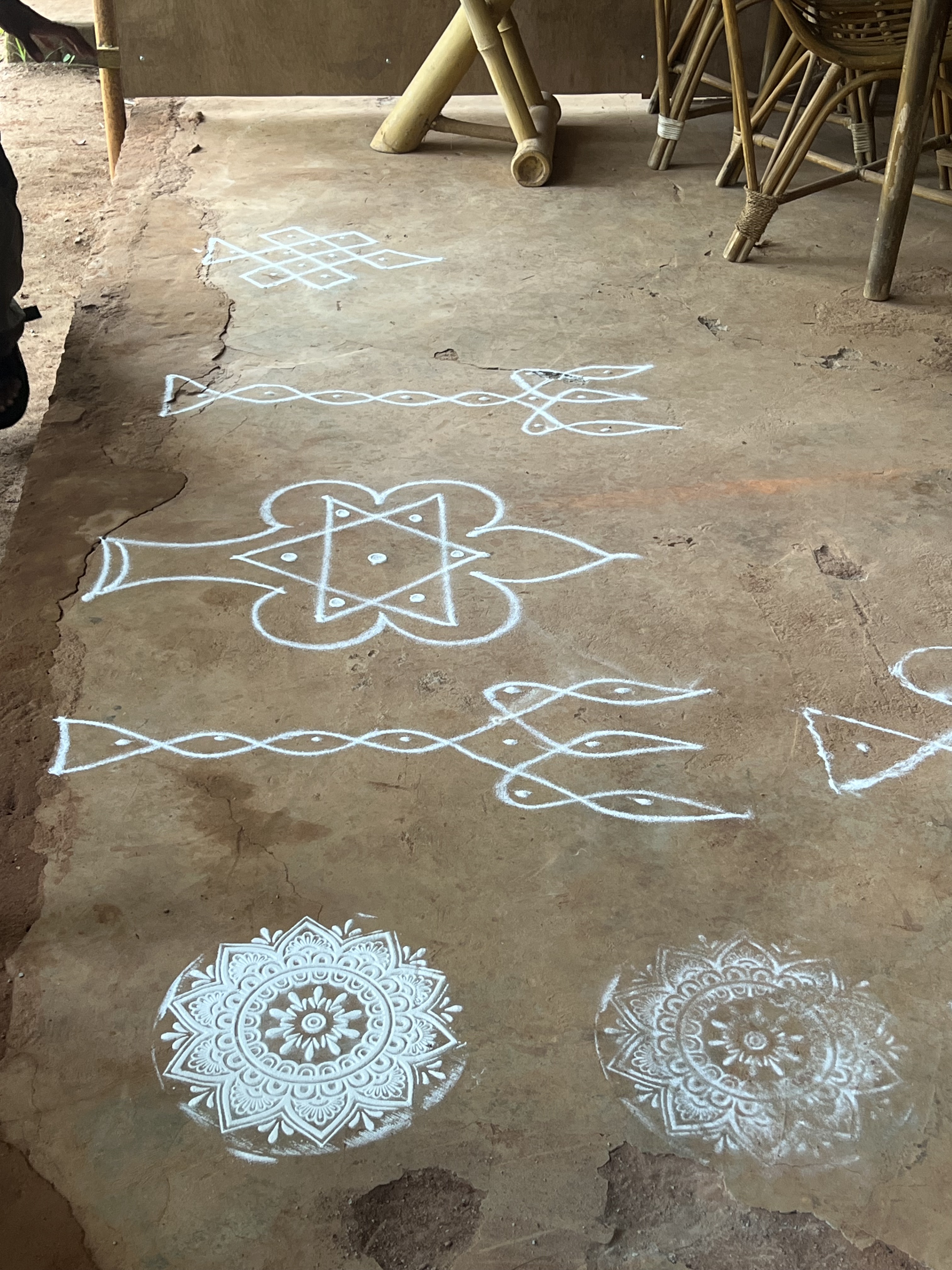 Our group of AUP students were lucky enough to see the process of the traditional art of Kolam and even try it out for ourselves. In the Tamil language, the word Kolam means form and beauty and the practice dates back 5,000 years (Sampratishta). In the morning, women draw kolams outside in front of their homes on the ground using rice flour. Taking a pinch of rice flour at a time, they swiftly create intricate geometric designs composed of lines, dots and curves. A few of our students tried making a simple design and were quickly humbled. The process takes skill, a steady hand, and muscle memory, especially for large patterns. Over the course of the day the kolams get swept away from people walking on them or from insects and birds that feed on the flour, which creates a harmonious relationship to nature (Sampratishta). The following day they are drawn again.