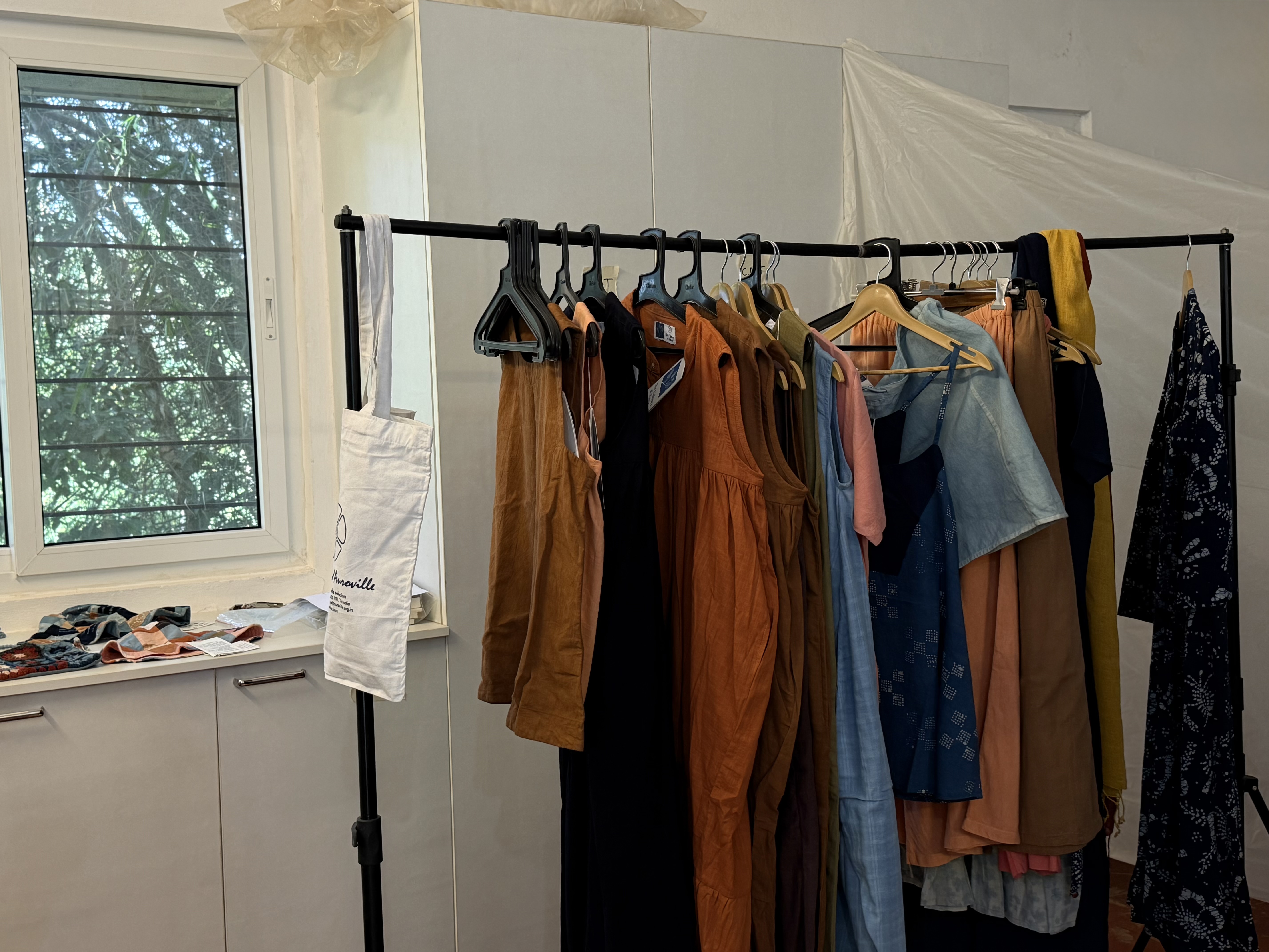 Throughout Auroville, objects show signs of use. Clothing racks hold items that have already lived full lives. Tools and equipment are repaired, reused, and stored carefully rather than replaced.