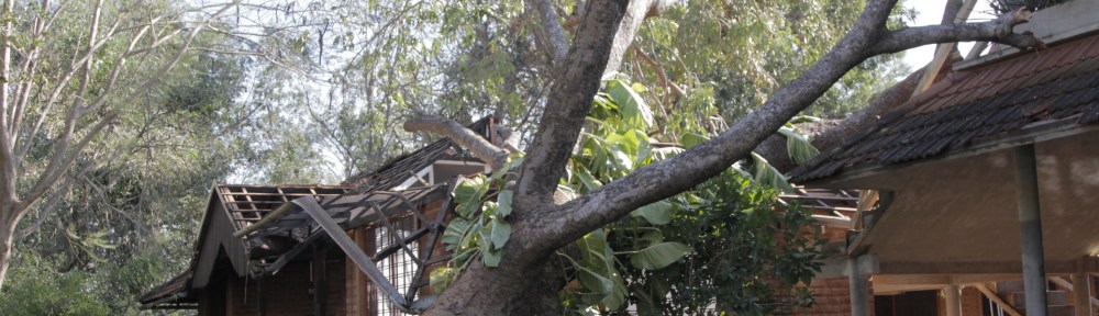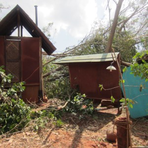 Damage to guest and resident housing structures at Evergreen Forest, a reforestation project in Auroville.