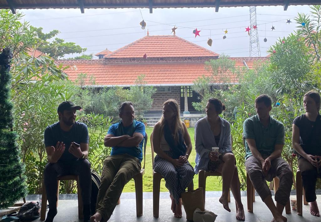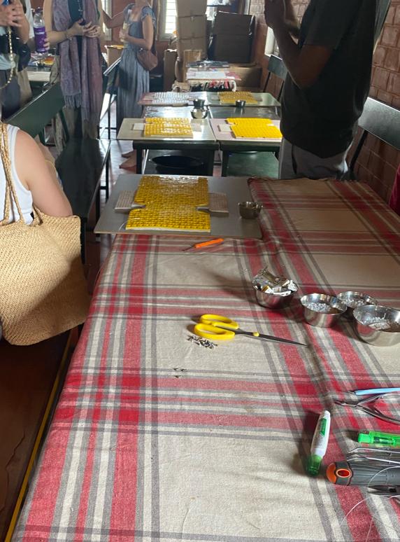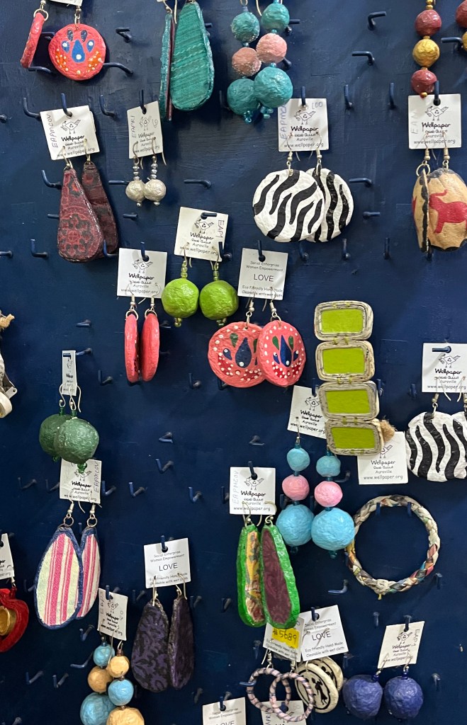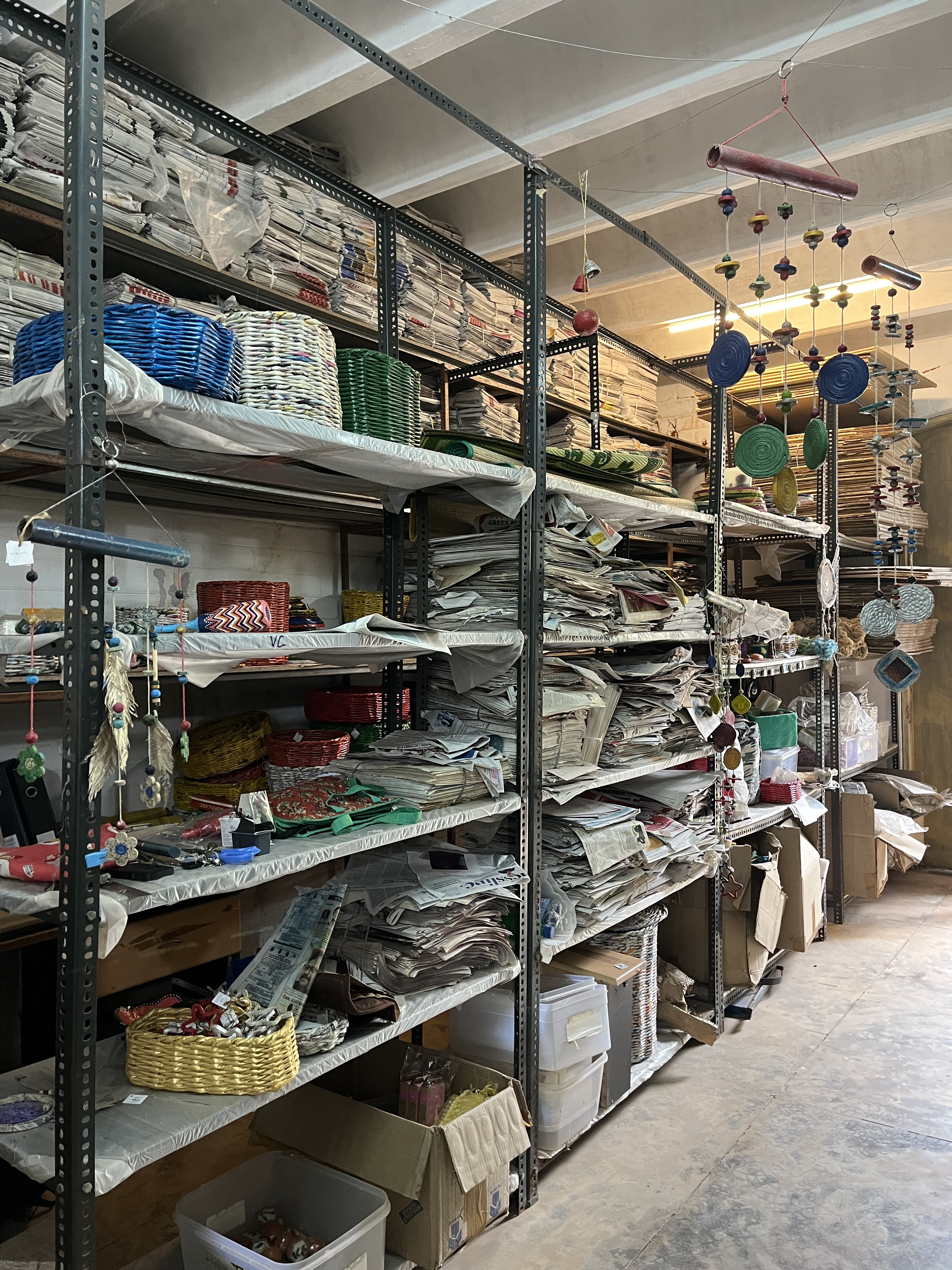 When we arrived at Wellpaper, we were brought into the studio/display room where all the handmade products are exhibited. There were many woven baskets and trays, as well as a large rotating jewelry display and a wall mural made of upcycled materials. The weaving method is a traditional cultural method. Wellpaper is unique in the sense that it uses rolled scrap paper coils for the weaving material. We were able to watch a live demonstration as a workshop was just ending. The women begin by taking a single piece of paper, finding a corner, and rolling it tightly. They seal it with a glue substance. To weave items, they begin by assembling a base. To facilitate this process, they often create the base around an existing box to achieve the desired shape. Once a base is made, they continue adding coils and weaving them together to add height and dimension to their creation.